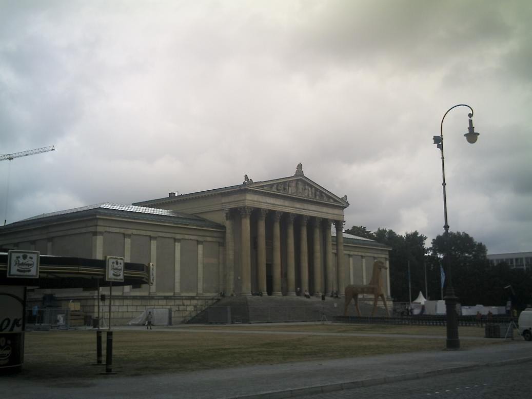Depois eu fui em direção a Konigplatz, com seu estilo romano (fotos 57 a 73), onde fica a “Gliptoteca” (fotos 57 a 63) e a Galeria Nacional de Antiguidades (fotos 64 a 72), abrigando esculturas gregas e romanas e agora elas estão com a amostra de arte dedicada a Tróia e no centro da praça fica o “Propilaen” (foto 73), inspirado no Propileu da Acrópole de Atenas.